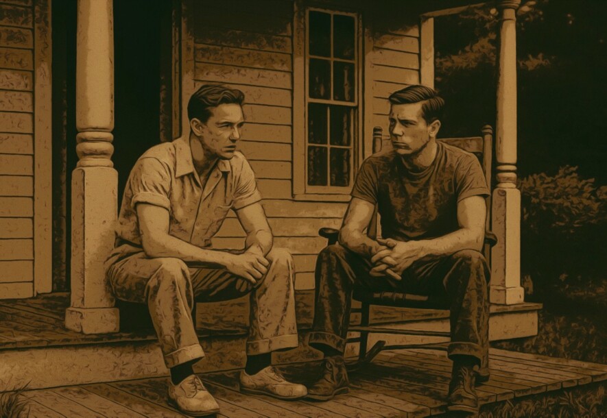 Adrien et Albert sortirent de la maison pour s’asseoir sur le bord de la galerie pour jaser. Illustration : Dallaire Production