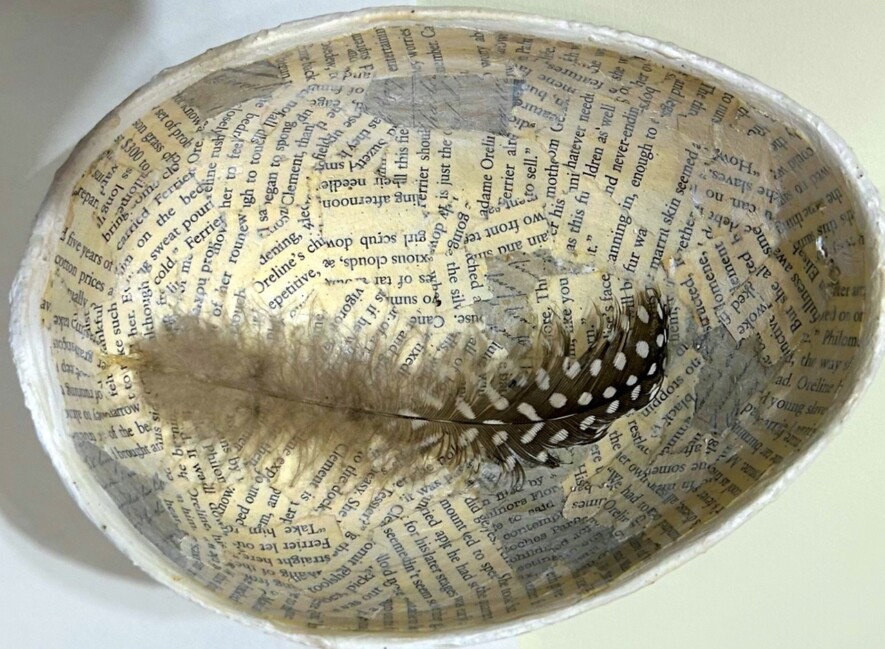 Confinée chez elle, elle découvre dans son jardin le début d’une aventure artistique. Après un orage, elle remarque sur le sol une minuscule demi-coquille bleutée remplie de trésors naturels déposés par le vent. Ce microcosme parfait devient alors une obsession. Elle crée de merveilleuses sculptures à partir d’œufs ordinaires, ce qui lui vaut le premier prix de la Société internationale des arts expérimentaux durant une exposition à la galerie d’art de Saint-Albert en 2022.