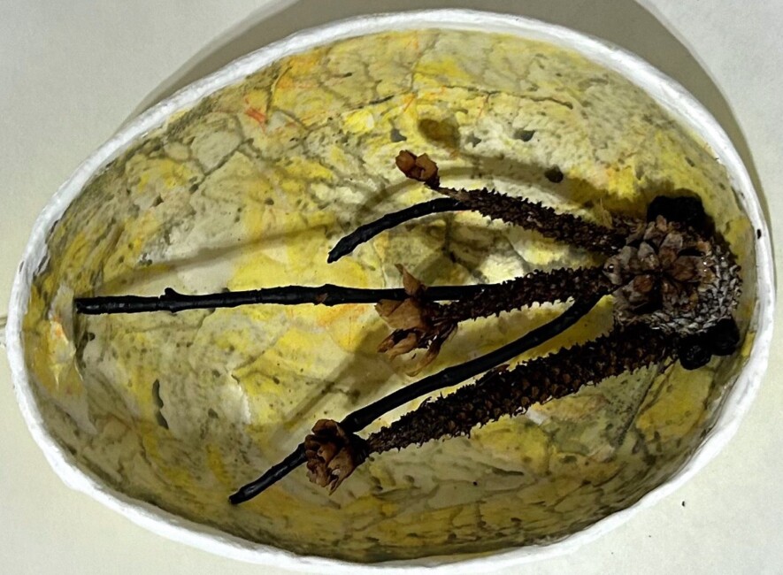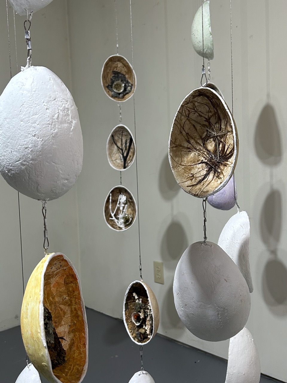 Peu à peu, une exposition d’envergure prend forme autour d’un thème qui lui est cher : comment regarder la beauté du quotidien à travers la nature, peu importe où l’on habite. Une dizaine d’œufs d’autruche flottant dans l’espace et remplis de délicates compositions sont notamment au rendez-vous. Un bas-relief mural composé d’une série de sculptures créées à partir de petites branches peintes en blanc et semblant s’envoler dans un souffle invisible fait également partie des œuvres. L’artiste nous invite dans son jardin de jeu, un monde où l’on crée avec ce que l’on a sous la main.