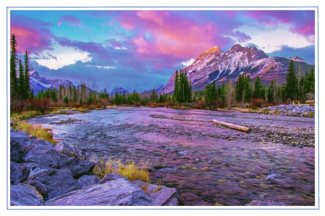 Photographie de Frank T. Scott, Castle Mountain and Bow River. Cette photo (16x20) a été prise fin novembre lorsque le soleil entame sa descente.