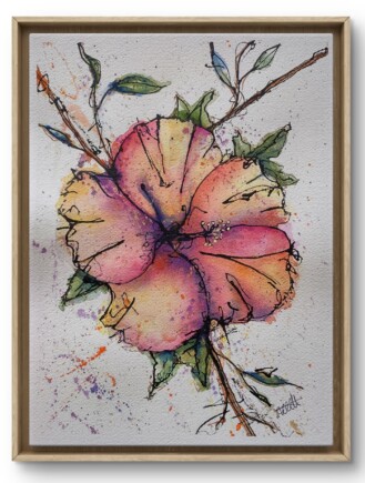 Hibiscus, aquarelle et encre de Chine sur papier Arches (9”x11”) d’Isabelle Larochelle.