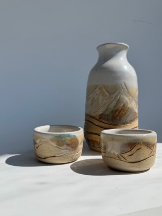 From Rice to Rockies est un service à saké créé par Melba Seto et inspiré par les aventures de l’artiste dans les Rocheuses. Il s’agit d’un récipient en porcelaine de 500 ml faite à la main et tournée sur un tour de potier.