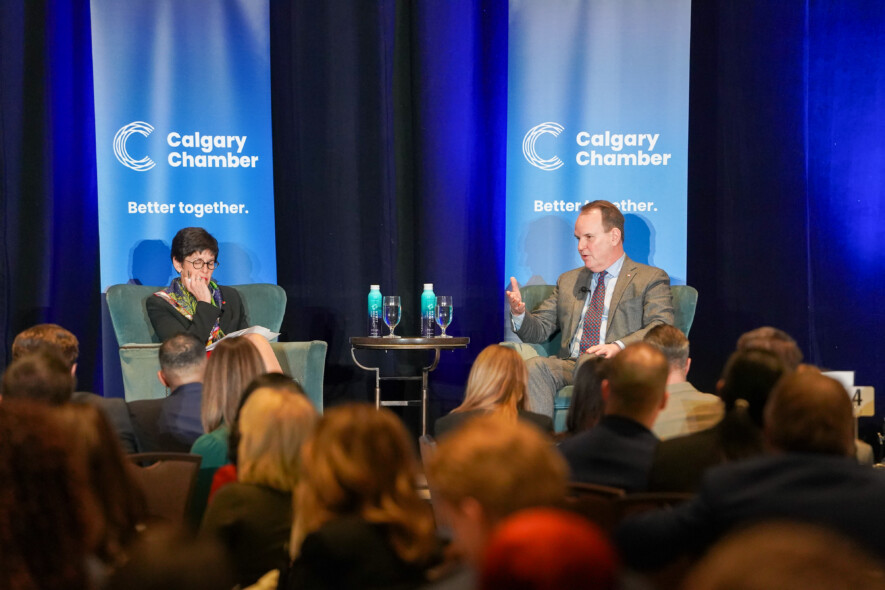A droite, le ministre fédéral des transports, M. Steven Mackinnon sur le plateau de discussion à Calgary ; à gauche, Mme Deborah Yedlin, présidente et chef de la direction de la Chambre de commerce de Calgary, devant des membres de la Chambre de commerce. Mme Yedlin a animé une conversation avec le ministre après son allocution, jouant ainsi un rôle d’interlocutrice.