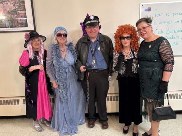 (De gauche à droite) Rollande, Arlette, Andrew, Nathalie et Céline sont prêts à en découdre pour le plus beau costume. Photo : Courtoisie – DClic