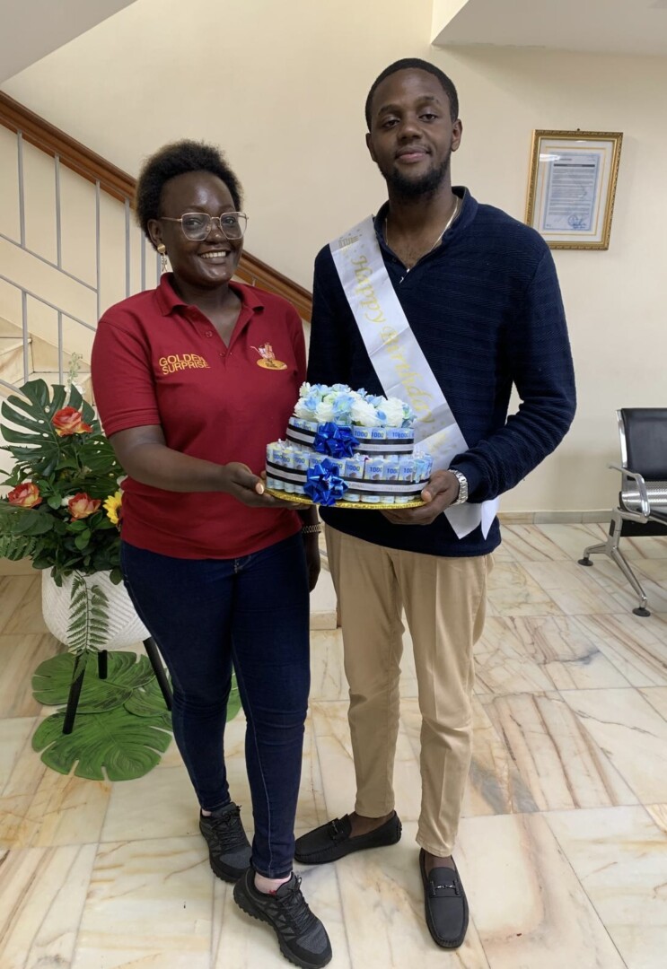 Une image de Cynthia Bille, Golden Surprise, offrant money cake surprise à un bénéficiaire.